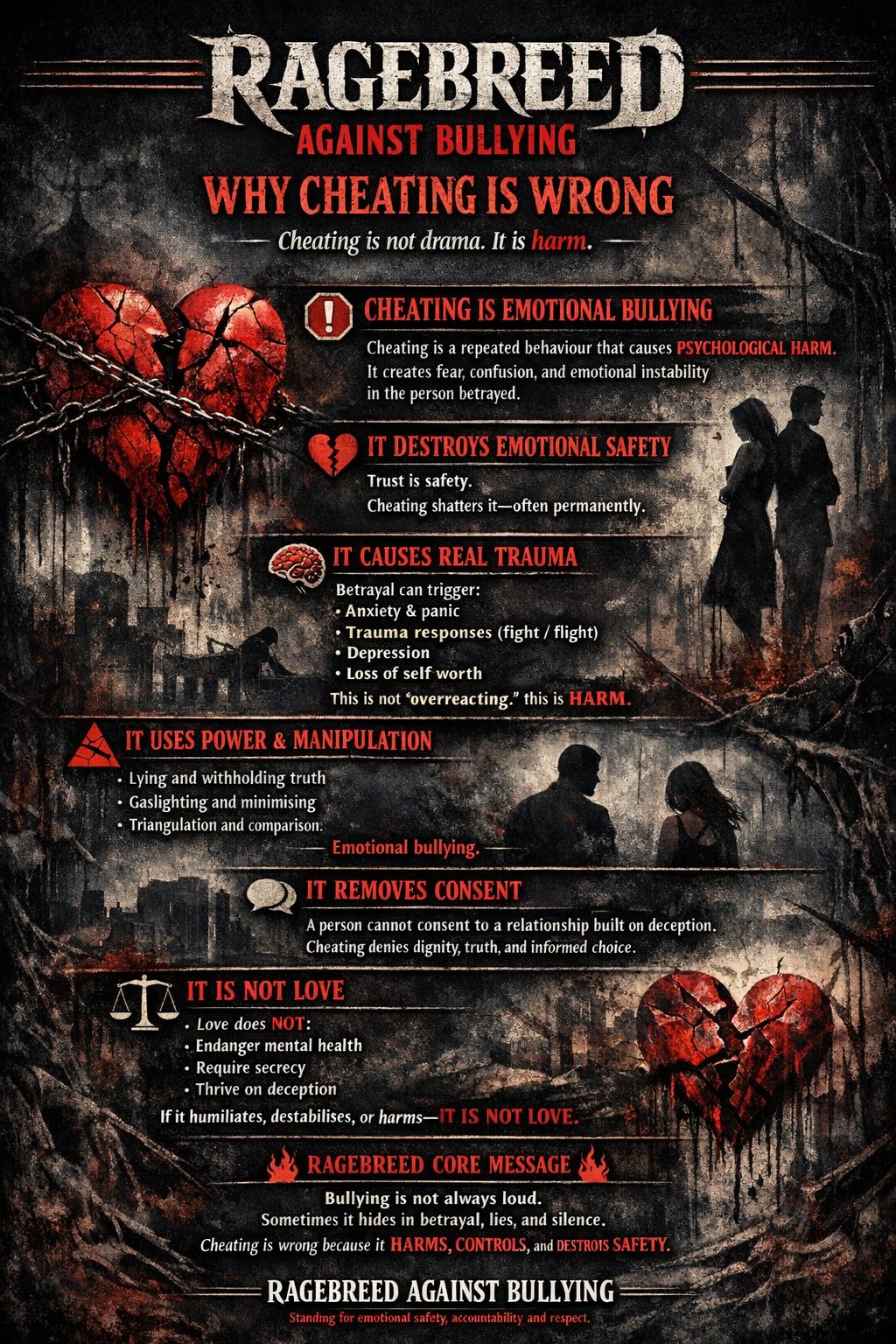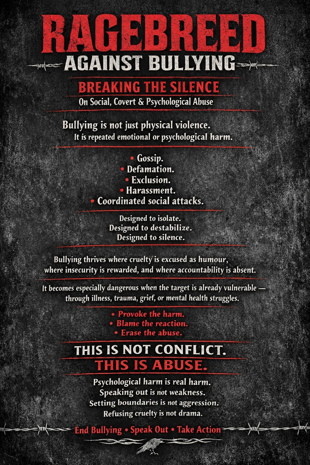 The Ragebreed Against Bullying Podcast is a raw, survivor-led audio series dedicated to exposing bullying, psychological abuse, coercive control, bullying, prejudices, cheating, and covert harm that often goes unrecognised or unchallenged. Each episode addresses real-world experiences such as stonewalling, gaslighting, and online bullying, trauma responses, safeguarding, boundaries, and recovery, always focusing on behaviour, impact, and accountability rather than minimisation or excuses. The podcast exists to break the silence, name the harm, and protect survivors, offering a space where lived experience is validated, patterns are clearly identified, and listeners are reminded they are not alone. Whether survivor stories led by LGBTQ+ community or band members or those that just wanted to express their support, Ragebreed Against Bullying has become a powerful initiative to stop enabling abusive people and to speak out to inspire and not be silent in this age of abuse.