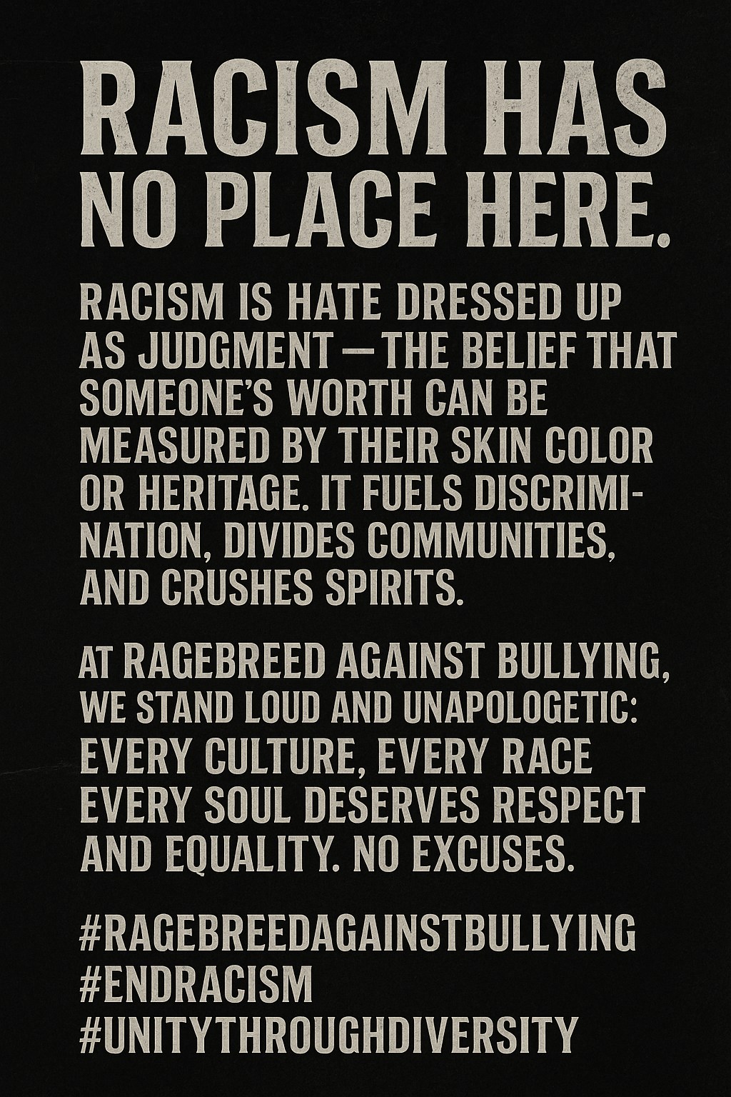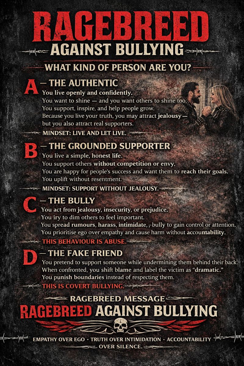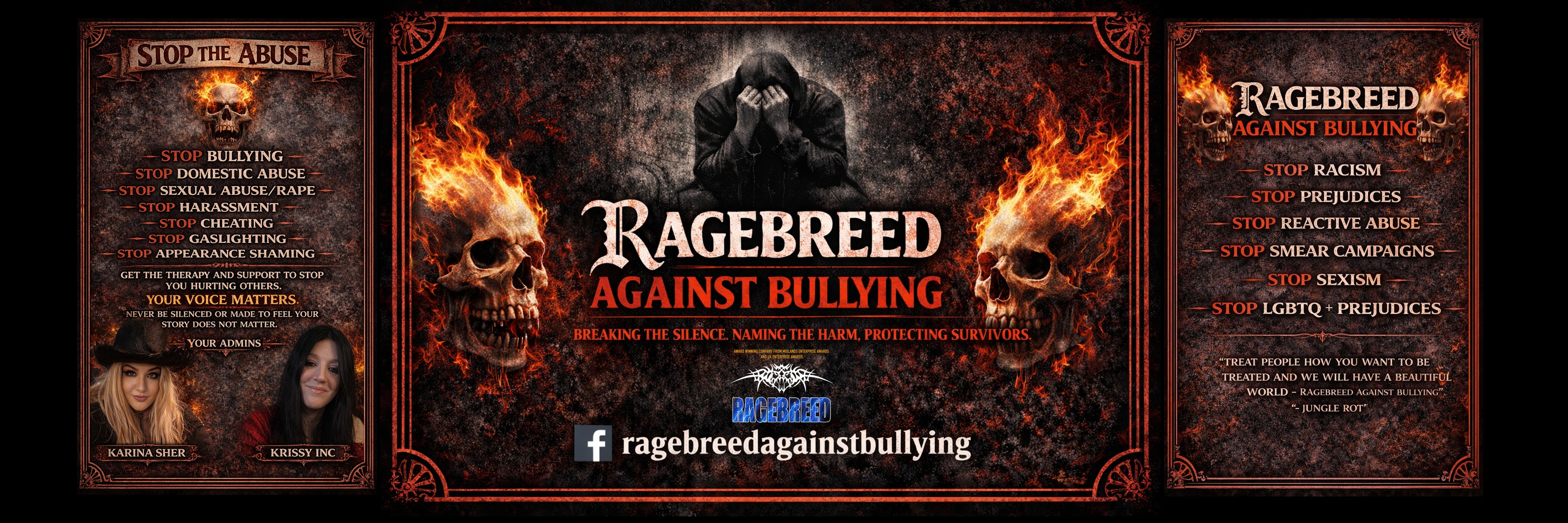 Ragebreed Against Bullying is an anti-bullying initiative spearheaded by Ragebreed, an internationally recognized brand within the rock, metal, and gothic music scenes. With deep roots in underground music culture, Ragebreed has long been a platform that amplifies voices of resilience, empowerment, and unity. The Ragebreed Against Bullying campaign reflects these values, channeling the energy and defiance of alternative subcultures into a direct stand against all forms of bullying—whether in schools, workplaces, online spaces, or within the music community itself. At its core, the campaign raises awareness about the devastating effects of bullying, while offering support resources, educational content, and safe spaces for those affected. Recognizing that individuals in alternative subcultures often face marginalization or ostracism, Ragebreed Against Bullying explicitly advocates for inclusion, mental health awareness, and self-expression without fear of ridicule or harassment. Key aspects of the initiative include: