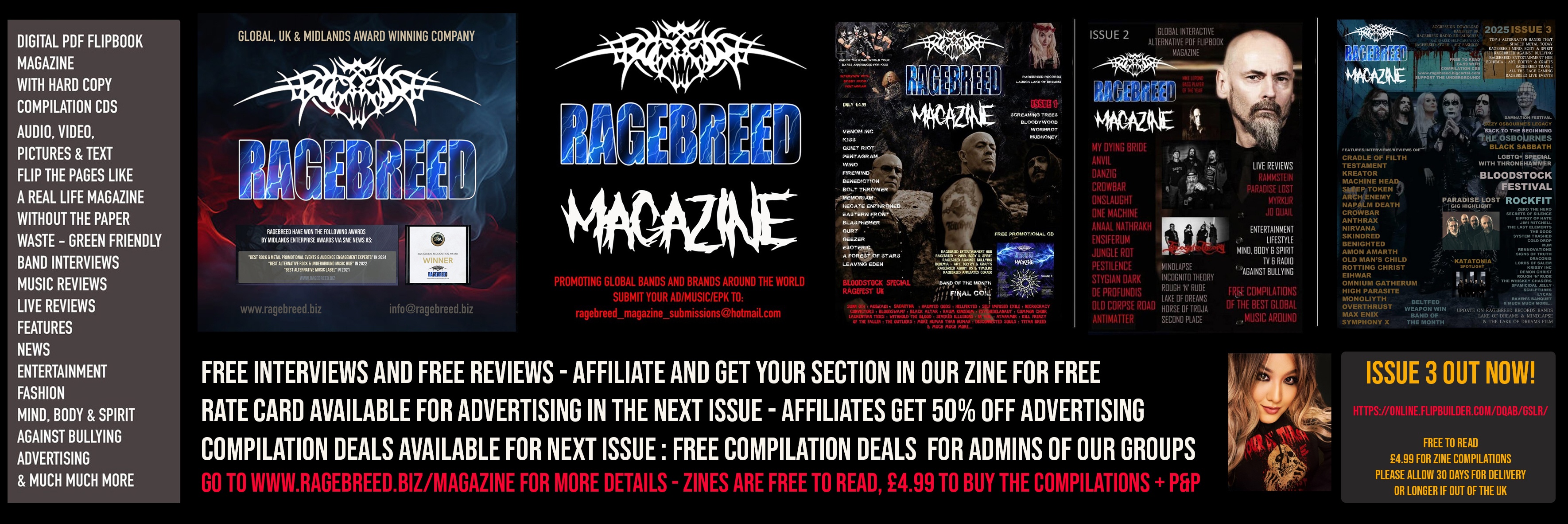 Published in a PDF Flipbook magazine and free to read online, the magazine reaches a global audience, with contributors, readers, and featured artists spanning Europe, North America, and beyond. It works hand-in-hand with Ragebreed Records, Ragebreed Promotions, and other arms of the brand to foster a holistic ecosystem for underground artists and fans alike. You can buy the flipbook PDF magazine with hard copy compilations for just £4.99 at www.ragebreed.bigcartel.com. Ragebreed Magazine stands as a testament to the power of grassroots creativity, offering passionate, authentic, and unfiltered coverage of the heavy music world from the underground up.