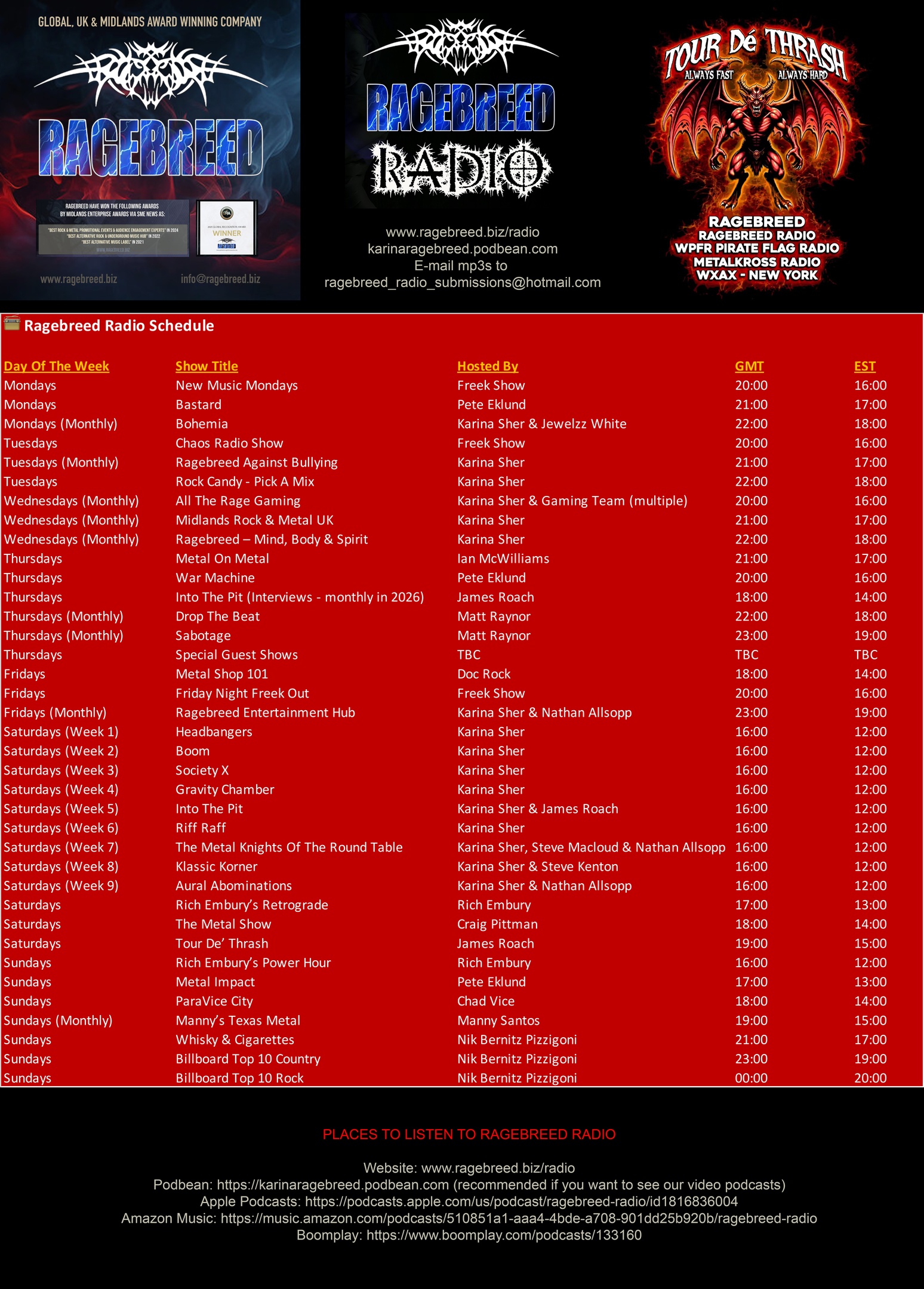 Ragebreed Radio is the broadcasting arm of the Ragebreed brand, dedicated to delivering the very best in underground metal, rock, and alternative music to listeners worldwide. Operating from the UK, but reaching a global audience, Ragebreed Radio offers a powerful platform for showcasing unsigned, independent, and emerging artists alongside established acts from across the heavy music spectrum. Founded and curated initially by Karina Sher, the driving force behind Ragebreed, the radio station embodies the brand’s core values of community, inclusivity, and grassroots support. It features a diverse range of pre-recorded shows hosted by passionate internal and external affiliate DJs, musicians, and scene advocates who bring their own unique tastes and expertise to the airwaves. Listeners can expect genre-spanning playlists—from death metal, doom, to classic rock, nu-metal, hardcore, alternative to industrial to stoner rock, gothic, metalcore, and progressive—all with an emphasis on mainstream, underground and alternative sounds. Ragebreed Radio not only spins music but also provides interviews, band features, and special themed shows that keep the underground scene alive and thriving. It serves as an essential extension of Ragebreed Records, Ragebreed Magazine, and Ragebreed Promotions, helping to amplify the voices and music of artists supported across the entire Ragebreed network. With a focus on creating an interactive and engaging listening experience, the station often involves its audience through requests, shout-outs, competitions, and collaborative projects—strengthening the community spirit that Ragebreed is known for. Accessible online and broadcasting globally, Ragebreed Radio continues to be a vital hub for fans and artists alike who are passionate about authentic, heavy music from the underground up. Please note, Ragebreed Radio is covered by PRS License.